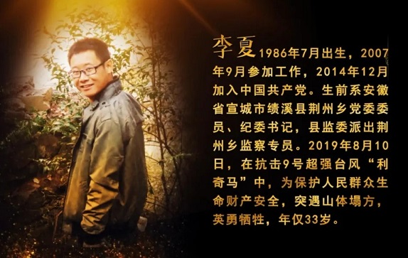 影片中,李夏同志生前是安徽省宣城市績(jì)溪縣荊州鄉黨委委員、紀委書(shū)記,縣監委派出荊州鄉監察專(zhuān)員。他堅定理想信念、堅守初心使命,十余年來(lái),始終奮戰在脫貧攻堅、鄉村振興、正風(fēng)肅紀第一線(xiàn)。他堅持原則、一身正氣,在紀檢監察工作崗位上,敢于較真碰硬,鐵面執紀執法,突出整治群眾身邊腐敗和作風(fēng)問(wèn)題,推動(dòng)全面從嚴治黨不斷向基層延伸。2019年8月10日,在抗擊臺風(fēng)利奇馬時(shí)以身殉職,年僅33歲。