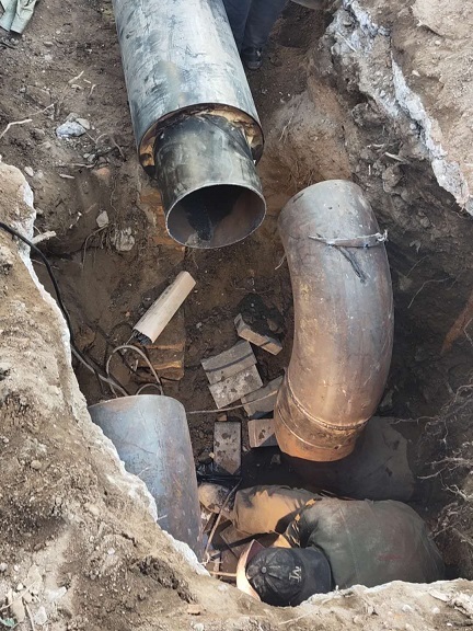 9月27日,展東路與海拉爾大街十字路口的一次網(wǎng)跑水,開(kāi)挖后發(fā)現相鄰的排污管道有破損,供熱管道浸泡在污水中,腐蝕嚴重,需要先處理好污水管道才能搶修熱力管道,增大了施工難度。經(jīng)過(guò)幾次嘗試,最終決定對漏點(diǎn)處進(jìn)行線(xiàn)位改遷,重新鋪設管道。經(jīng)過(guò)10天持續不斷、緊張輪流作業(yè),于10月6日中午,終于修復管網(wǎng)漏點(diǎn),保證了管網(wǎng)注水試壓。