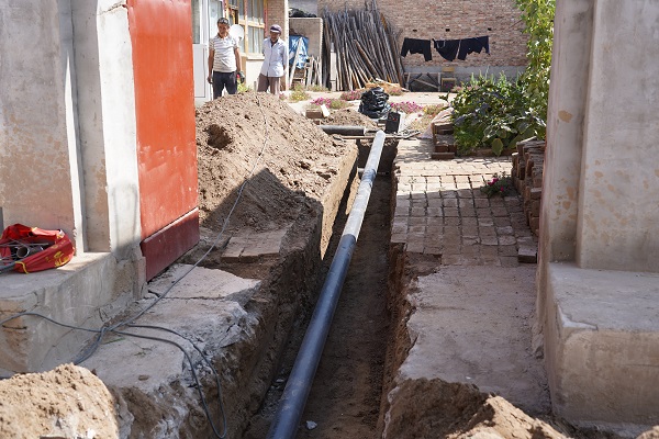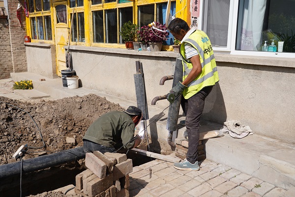 9月2日上午,在西黑河村的一戶(hù)村民院內,一名施工人員正在進(jìn)行院內管網(wǎng)與入戶(hù)管網(wǎng)接口的焊接工作。