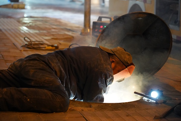 坑里挖的熱火朝天,坑外的工作人員也不停歇的忙著(zhù)。在距離開(kāi)挖點(diǎn)2米的一個(gè)管道井,一位師傅正趴在井口旁邊,上半身倒栽在進(jìn)井口,焊接著(zhù)距離井口半米遠的排氣閥門(mén),筆者站在遠處,都能聞到濃濃的電焊味道,而作業(yè)的師傅也被電焊產(chǎn)生的煙氣嗆得不停的流眼淚,時(shí)不時(shí)地從井口起身?yè)Q口氣。