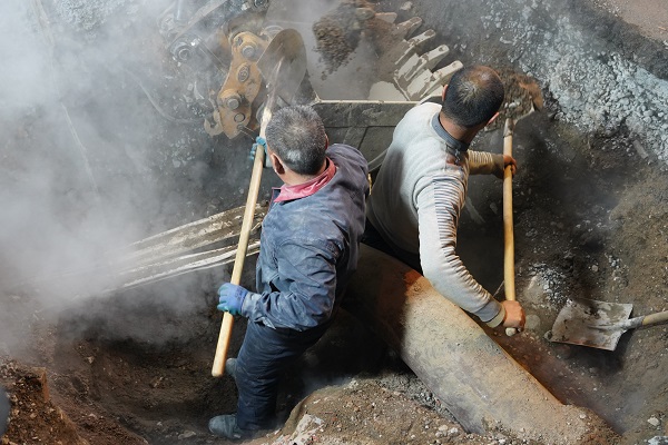 筆者于晚間6:00抵達搶修現場(chǎng)時(shí),大老遠地就看見(jiàn)沿路的井蓋都冒著(zhù)白色的水蒸氣,進(jìn)入搶修現場(chǎng),筆者看到,橋靠分公司總經(jīng)理阮強、副總經(jīng)理張國良、運營(yíng)四所所長(cháng)馮俊及公用事業(yè)管理局相關(guān)領(lǐng)導在現場(chǎng)緊鑼密鼓地指揮著(zhù)搶修?,F場(chǎng)兩個(gè)搶修師傅正在一個(gè)10平方米、2米多深的大坑中,一鍬一鍬地奮力挖著(zhù)坑內的土,現場(chǎng)工作人員介紹到,因為已經(jīng)接近管道,為確保管道的安全,目前只能人工挖掘。當時(shí)的室外溫度在-11℃,工人們卻是滿(mǎn)頭大汗。