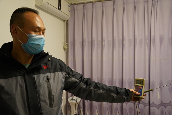 在20號樓3單元6樓的住戶(hù)家中,劉婷用手摸了摸用戶(hù)家的地板磚,通過(guò)人體的直觀(guān)感受,發(fā)現用戶(hù)家地暖存在散熱不均勻的現象??头芗矣脤?zhuān)業(yè)的測溫儀和熱成像儀,進(jìn)行了測溫。經(jīng)檢測,該用戶(hù)家各房間平均溫度均在23℃以上。用戶(hù)說(shuō),家中較冷的房間是廚房,客服管家又針對廚房進(jìn)行了測溫,發(fā)現室溫要比其他房間溫度低一些,但熱成像儀測得的結果與其他房間一致。經(jīng)過(guò)觀(guān)察與分析,發(fā)現用戶(hù)家廚房與陽(yáng)臺間的隔斷是一扇落地大玻璃門(mén),保溫效果較差,導致廚房溫度低于其他房間。聽(tīng)了工作人員的講解,用戶(hù)也表示了認可,對我們的排查結果及服務(wù)態(tài)度表示滿(mǎn)意。