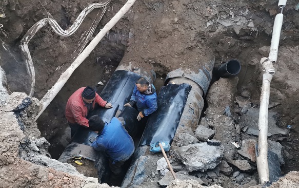 在場(chǎng)人員研究制定了搶修方案,決定不更換管道,而采用"包裹式"的方式進(jìn)行修復--在原DN700的老舊管道上包裹DN800的管套封堵漏點(diǎn),將DN800的管道切割成兩部分,分別安裝,與水泥管道接近的部分打磨成壁度在4公分以?xún)鹊墓鼙?,焊接后進(jìn)行管道碰口。當時(shí),室外溫度已降至-15℃,地溝內溫度高,地面溫度低,施工難度大。為保證快速、高效、安全完成新管套接,搶修人員只能手提工具沿著(zhù)管道貓著(zhù)腰爬到連接處,窩在管道下方,在管套與管網(wǎng)連接處焊接。