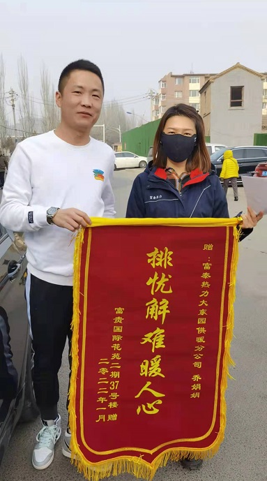 玉泉分公司員工喬娟娟在富貴國際花園走訪(fǎng)時(shí)得知小區二期37號樓進(jìn)入11月份后整棟樓就出現溫度偏低現象,她和同事們迅速開(kāi)始排查原因。該棟樓共有5層10戶(hù)熱用戶(hù),他們用了一天時(shí)間逐層逐戶(hù)對熱用戶(hù)家中的濾網(wǎng)進(jìn)行了清洗,但是效果不是很理想。于是他們又對負一層主管網(wǎng)的除污器進(jìn)行了清洗,一系列的操作完成后又是整整一天,第二天回訪(fǎng)熱用戶(hù)時(shí)得知溫度只提升了2度,為了讓熱用戶(hù)溫暖過(guò)冬,喬娟娟又和同事們對該棟樓主管道的所有支管進(jìn)行了沖洗,再次回訪(fǎng)熱用戶(hù)時(shí)發(fā)現,該棟樓其他熱用戶(hù)家中溫度都很好,只有301熱用戶(hù)家中的溫度還是偏低,為了找到原因,喬娟娟和同事們對用戶(hù)家中的暖氣管道敷設情況進(jìn)行了測量,再次沖洗了管道,同時(shí)積極聯(lián)系到已經(jīng)辦理停供的401熱用戶(hù)進(jìn)行了復供,該熱用戶(hù)家中溫度偏低問(wèn)題得到解決。"排憂(yōu)解難暖人心"為了表達感謝之情,1月9日,301熱用戶(hù)聯(lián)系到了正在小區走訪(fǎng)的喬娟娟,親手遞給她一面錦旗。