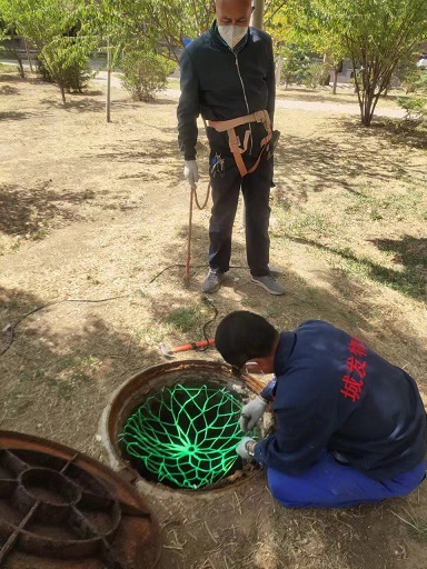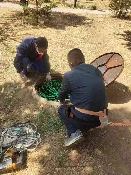 安裝現場(chǎng),工作人員打開(kāi)井蓋通風(fēng),在用氣體檢測儀檢測井內的氣體符合作業(yè)條件后,工作人員綁好安全帶用電鉆在井壁上鉆孔,釘入尾端帶鉤的膨脹螺栓,擰緊固定后將防墜網(wǎng)掛到掛鉤上,一張防墜網(wǎng)就安裝完成?,F場(chǎng)工程師傅每完成一個(gè)防墜網(wǎng)的安裝,在確保安全的情況下,都會(huì )親身踩試檢驗,確保安裝牢固。