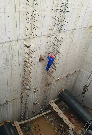 7月28日上午,遠遠就看到一名施工人員正沿著(zhù)沉井壁上的幾根鋼筋小心翼翼地下到沉井底部,筆者看的是膽戰心驚,沉井底部有兩名焊工正在焊接管線(xiàn)接口。