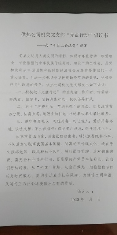 為了進(jìn)一步弘揚中華民族勤儉節約的美德,積極響應黨和政府的號召。99日上午開(kāi)始,城發(fā)供熱公司機關(guān)黨支部黨員、發(fā)展對象、積極分子共40人陸續簽署光盤(pán)行動(dòng)倡議書(shū)。